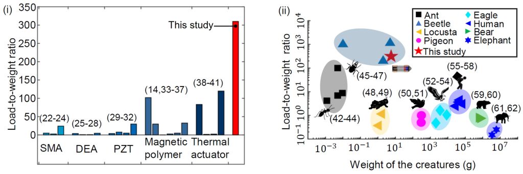 MiaBot负载性能与当前微小型机器人及动物负载性能对比图
